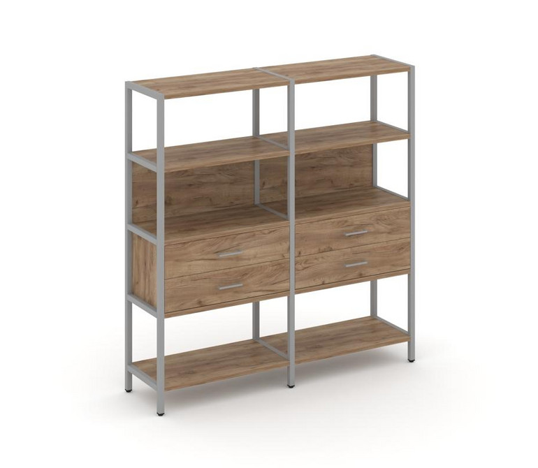 Shelf System Двухсекционный стеллаж четырехярусный с ящиками SN.STM-422 Дуб Табак/Металл Серый 1590*