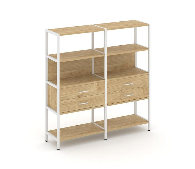 Shelf System Двухсекционный стеллаж четырехярусный с ящиками SN.STM-422 Тиквуд Светлый/Металл Белый