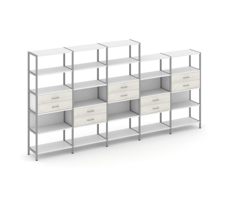 Shelf System Пятисекционный стеллаж пятиярусный с ящиками SN.STM-551 Белый/Дуб Наварра/Металл Серый