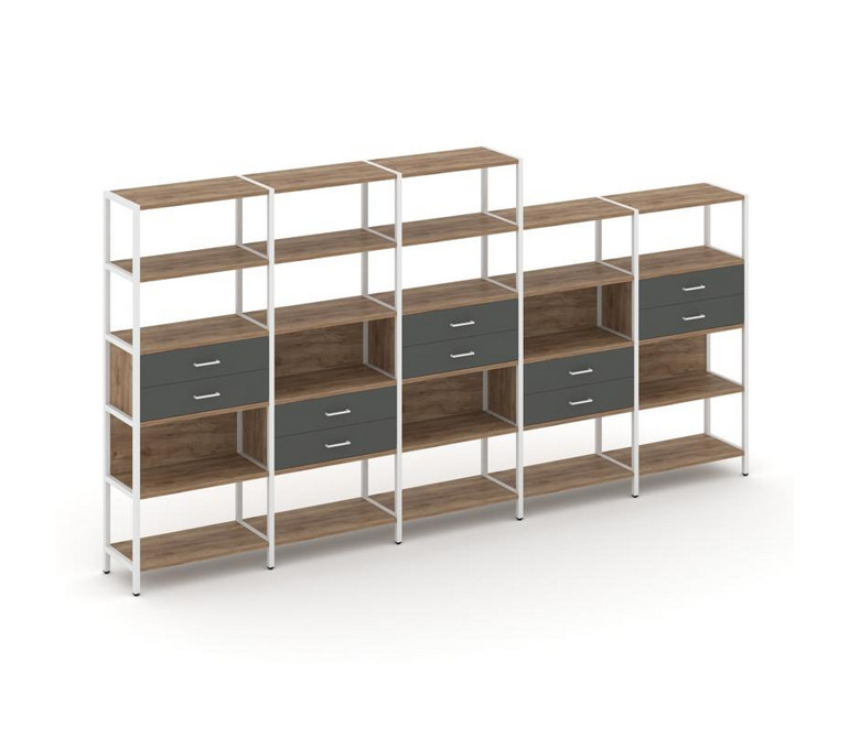 Shelf System Пятисекционный стеллаж пятиярусный с ящиками SN.STM-551 Дуб Табак/Антрацит/Металл Белый